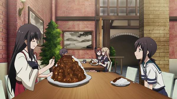 咖哩對決,最後是第六驅逐隊的甜咖哩取得勝利,總之是日常回。說來日本人比較不吃辣,自然辣味就不會勝出。本話很多笑點都是在遊戲梗或者是艦娘梗比較多。例如赤城就是一次要吃很多的類型->重視補給的類型,遠征失敗等等,這個設定就成為搞笑的題材。