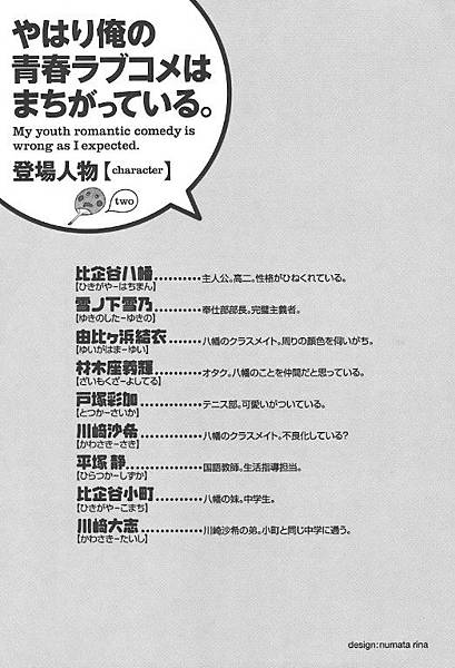 千叶市立总武高中二年級F班的男主角,比企谷八幡,被導師帶去加入侍奉部,途中遇到的各式人物和情節。