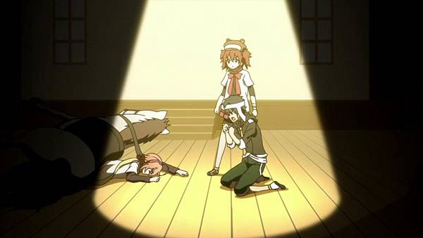 鏡頭一開始是御神樂星鎖在晚上的學校被一個前輩的人追著,用類似光束砲的東西打中的情節。