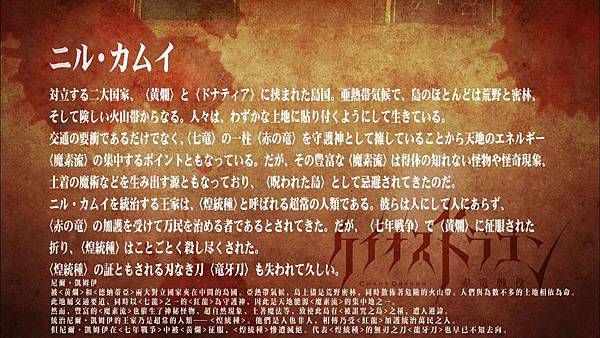 幾個小孩在吵架,這時主角在獨白說尼爾。凱姆伊是個島國,被西方的大國黃爛攻下1/3的土地,東西的同盟國也攻打過來,連守護的紅龍發狂開始攻擊村莊的人民,就是現在的模樣。