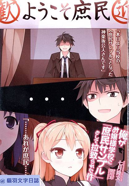 這次的故事筆記也是2015年秋番的動畫。原作是輕小說,這次就來寫這個故事的讀後心得。我被綁架到貴族女校當「庶民樣本」。這個書名看起來好像典型的廢萌作,但不知為何漫畫居然可以到40多話,還是個比較不知名文庫第一部動畫化的輕小說,我推測這個銷量不會太差因此來介紹這部了,我的理由總是這麼嚴肅,各位看看就好。