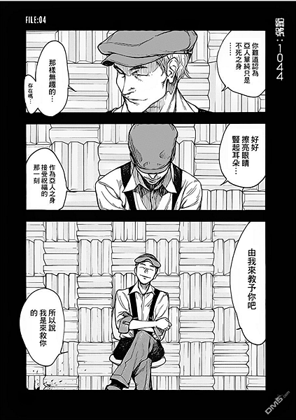 中村慎也在一次受傷右手整個切掉卻沒死,手很快恢復受傷前的原狀,中村發現自己是亞人,第一件事情是看周圍是否有人發現他就是亞人的事情,似乎有人發現中村,但中村沒發現對方。主角回去找資料時,這邊開始說明亞人的背景設定,亞人除了不死以外與人類幾乎無異,目前世界上發現45人,但亞人也是很重要的研究對象,因此出現補捉亞人的情況。中村似乎是騎機車受到的傷,主角把被切斷的右手藏在家裡,這時候中村的大學同學裕介上門找主角。這是很平常的事件,中村內心對於自己是亞人的事情有點掙扎,但又不能和同學說明。