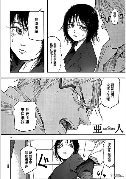 可疑對象向研究室被抓到在進行研究的田中君搭話,研究人員已經被可疑人物打倒。永井和海鬥君逃到深山的一間小屋。這時候下村泉正在調查永井妹,她說她是亞人調查機關的人,並不是警察。主角妹是個討厭亞人的人,說小時候他們在埋寵物的時候,她記得主角要妹妹快逃的話,下村泉說是不是黑色的人形物體,但妹妹看不到的樣子。妹妹推測可能的逃亡共犯,這時下村泉突然被攻擊,附近有個亞人正操控黑色的人形攻擊下村泉。下村泉很快就站了起來,主角發現他能看到黑色的人形,大概這就是亞人的能力。