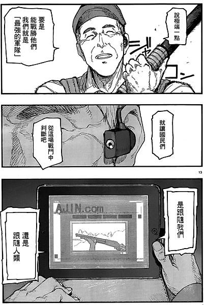 這一話在描述前幾話主角和帽子男行動另一邊的情況,戶崎在和總理大臣對談因此無暇顧及主角的逃跑。總理也不希望部隊白白送死。而戶崎也不想送頭,之所以下村泉沒有下場的原因是要保護他們。戶崎認為可能帽子男是今天不能使用另一種力量而不使用,因此打算派人處理。小倉博士不說黑影的使用方式,後來主角跳河逃走,上司們很生氣。研究機構主要是新藥的實驗、車子的碰撞測試,說亞人是經濟動物。