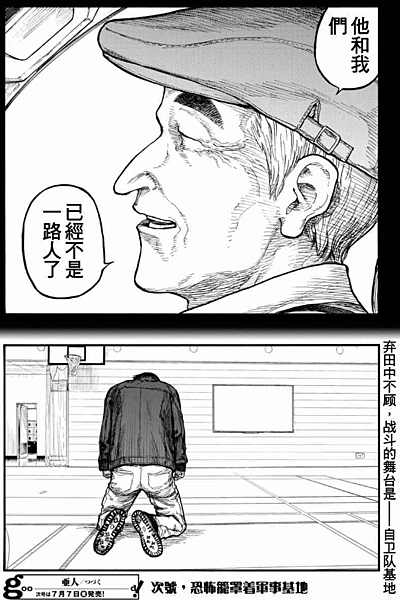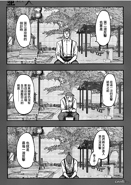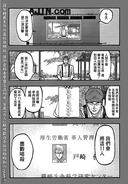 帽子男(佐藤)和田中目的已經達到了,只是裝作生氣想殺主角的樣子。接著是這兩人和一群記者的回合。田中說政府用亞人進行非人道的實驗,並將相關影片公開。說兩天後要在某地集會抗議。但這天出現的人寥寥可數。事實上這個作戰是田中要集結未公開亞人的作戰策略。