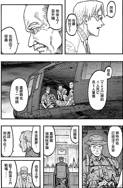提到佐藤以前的事情,佐藤曾經是訓練有素的組織「Team」的成員(共四名成員),在越戰結束一年,這四人要去救一個俘虜,於是很輕鬆地進到了俘虜的所在地,但不知怎麼地,佐藤故意開槍吸引敵人出現,四人很辛苦才得以離開,他自己也丟了一條腿,被開除軍藉,後來他成為了亞人,這就是開端,他的新戰場是永不結束的。