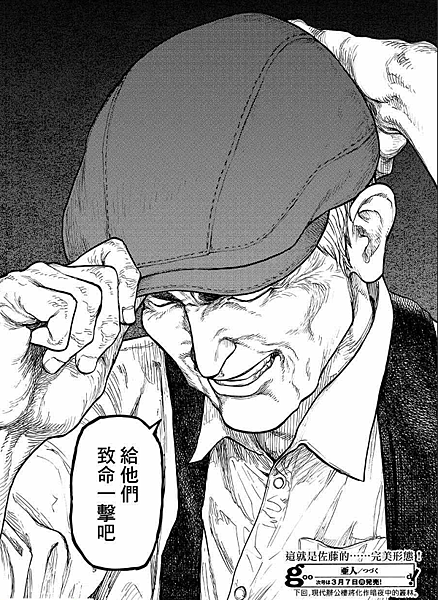 帽子男佐滕召集亞人後數日。帽子男向眾亞人提議可以實行大屠殺的方式,但有人不同意。主角發現有麻醉槍,佐滕開始召集支持者打算拘禁反對者。有兩個反對者,大叔打算跳樓逃生前被抓住了。少年逃走了。