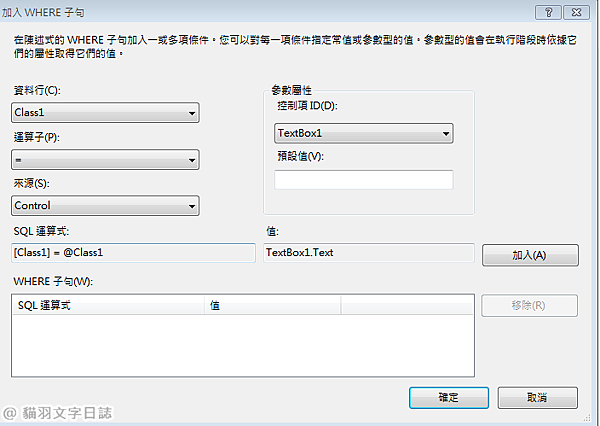 上述動作好後的下一步畫面,這個畫面的設定,Class是你要查詢的欄位名,Control是指網頁上的元件,控制項ID為要接值的元件ID,最後按加入後確定