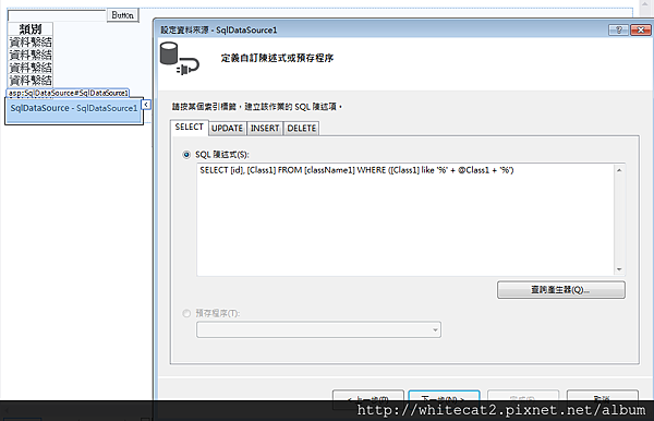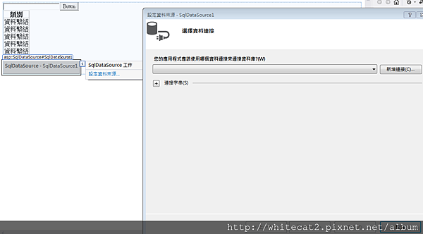 下面是操作步驟,先按sqlDataSource的設定資料來源,設定連線,可以在config設定資料連線