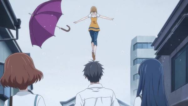 上一話的米蒂爾信心崩潰,於是主角回到一天前的過去,然後演了一場戲,老爺爺說自己的家被怪獸破壞,希望米蒂爾能修好它,米蒂爾接受自己是穗乃歌的事實。這邊有相麻和女主角見面的喬段(13:40左右)。宇川小姐看到這個世界的人也有互助,也就不使用能力(讓建築物消失)。