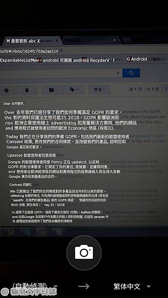 最後來簡單實測一下拍照翻譯的方式。例如以下的google隱私權訂正信件為例,先對焦拍照後選取右下的語言,如果有下載中文就會有中文的選項,選取後就會呈現以下的畫面,將翻譯後的文字以白色字體的方式呈現: