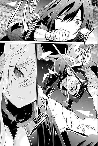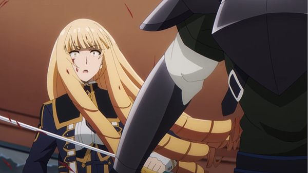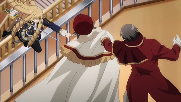 在動畫19話,動畫有演出杜埃姆公爵控制國王檔住學生會長剌來的一劍,因此接下來蘿絲就只能逃亡