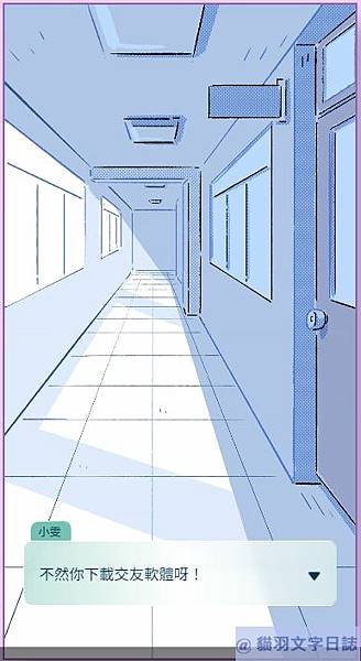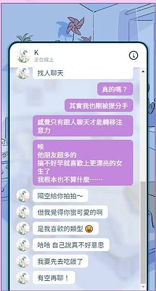 這款遊戲一開始提到女主角被人分手,在好友提議下使用了交友軟體找聊天的對象,就交到了新的聊天對象,後來因此交往。
