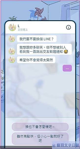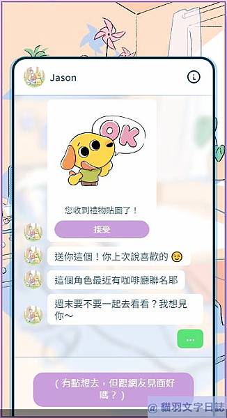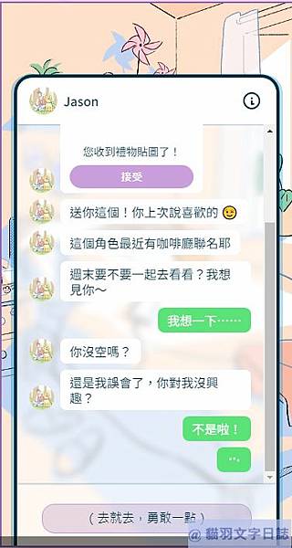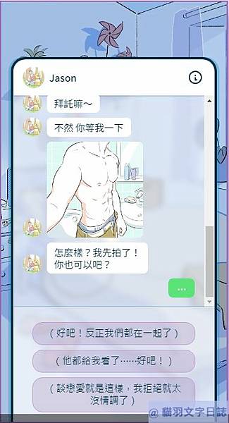 jason送貼圖,想約女主角出來見面,於是女主角打算過去見面。