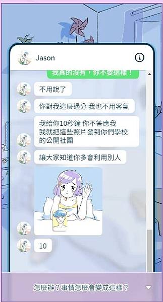 故事中的女主角被人分手,在好友提議下使用了交友軟體找聊天的對象,遇到一個叫佳森(jason)的網友,這個佳森網友有個有相當數量追隨量的IG帳號,女主角想說這個人還不錯,發現他也是高中生,於是聊了很開心,聊了一陣子後佳森想約見面,女生就答應,但到了現場發現對方怎麼都沒到,於是沮喪地回到家,後來佳森說他是遇到車禍受傷,女生就說怎麼會這樣,還好嗎?佳森說沒事。更熟了以後,佳森就提議交往,女主角答應了。從互相交換照片開始,女主角一開始勉為其難答應,慢慢地就被說服拍下裸照,之後女主角發現自己的祼照被上傳到網路上,女主角只能求助父母與警方,故事就在這邊結束。