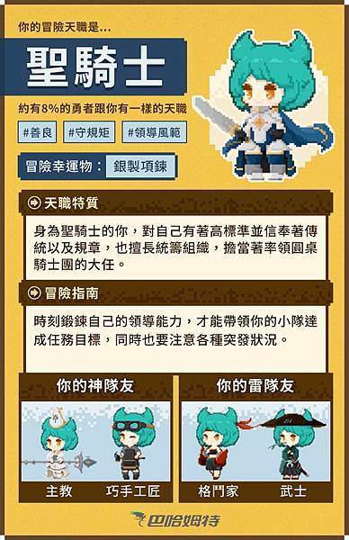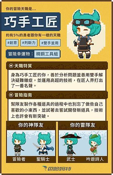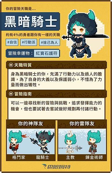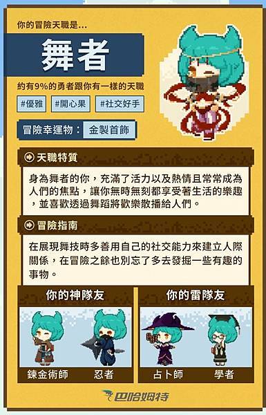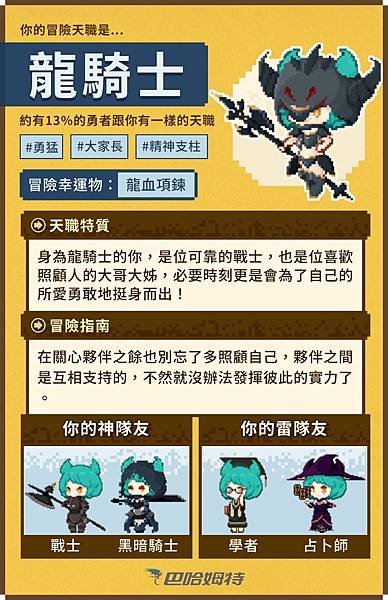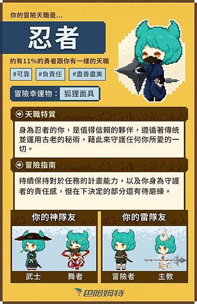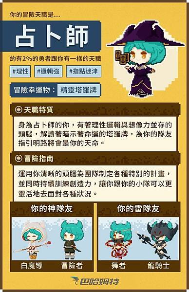 這個心理測驗是巴哈勇者造型20周年的活動,我的冒險天職 - 測出你靈魂裡擁有的冒險性格。這個心理測驗簡單地說就是出10題RPG類型的題目,假設你轉生到一個劍與魔法的世界,從探索這個世界的選擇,以職業說明你的冒險性格為何