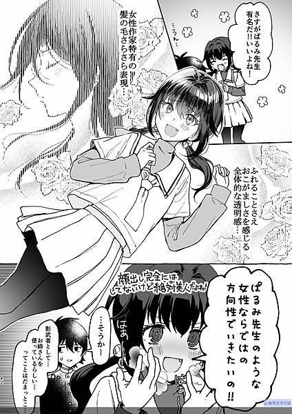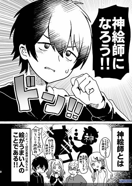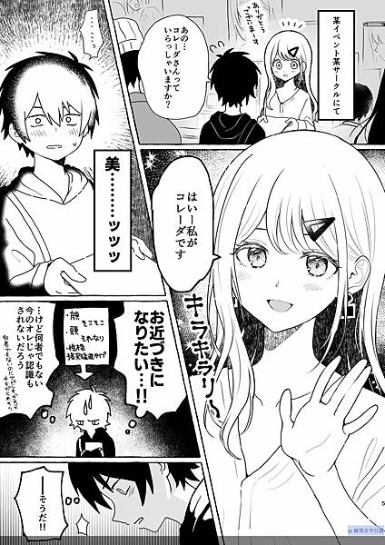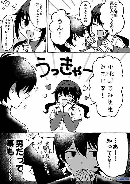 問了男主角才發現男主角就是苦練素描,由於男主角有擺過攤,了解比較多同人繪師的常識,於是展開各種吐槽。