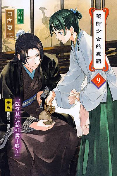 藥師少女的獨語第九卷概要,封面是女主角與雀。前半段女主角治療壬氏的燒傷,了解到自己的外科知識不足,但養父羅門以前從沒教這些,而且解剖需要大量練習,於是女主角請求劉醫官教她外科知識,還有解剖回,有點像在看大長今,大長今設定為內外科都會、能動婦產科這種外科手術,貓貓進修後可說是茘國的大長今,不,是輕小說版本的大長今了。就是各種的外科訓練回如下: