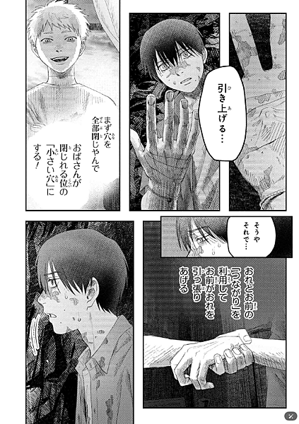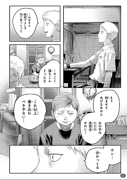 夏天背景的恐怖片其實滿多的,本作由於復活的「光」身上有著奇怪的物質,完全不曉得這是何種生物,「光」也說自己非人類,但主角幾乎都在與「光」互動,因此本作是那種氛氛比劇情還豐富的作品,劇中的男主角平常都和已經死亡的光一起行動,並且逐步揭露本作的背景設定,例如08話-09話主角是因為看到光死亡,因此曉得現在的光並不是本人,漫畫第10話提到光是如何死亡的等等。劇情到後來還提到詛咒、獻祭的設定。本作現在還在連載,已經差不多要完結,但劇情好像沒啥特別的爆點,我覺得本作主要是看氣氛,因為光身上的東西時不時會流出體外,還滿恐怖的,但主角仍和光一同行動,甚至主角還把這個光當朋友來看,有的人覺得有些微BL情節,但我覺得還好, 是氣氛>劇情的類型。