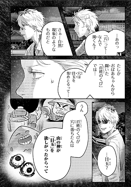 墨鏡男:「據說百姓之頸( 百姓のくび )掉進洞裡,是因為山的神明想要『眼珠』。」